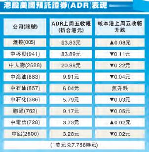 美股上周五在科技和工業股帶領下反覆向上,但最終仍與兩萬點擦身而過,收市報19963點,升64點。港股美國預託證券(ADR)上周五表現個別發展,當中豐控股(005)收報63.83元,較港收市升0.12%、騰訊控股(700)收報195.44元,升0.17%。若按比例計,相當於恒指微跌7點,至22495點。