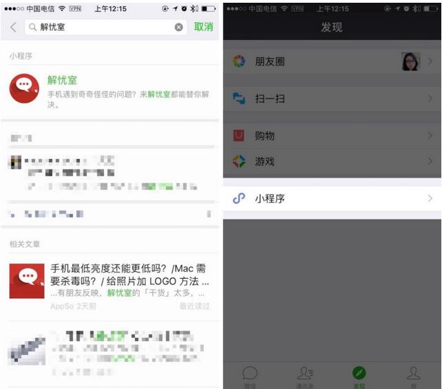 如果你還沒有使用過任何小程序,現在在微信首頁的搜索框搜索「解憂室」,點擊解憂室的小程序,發現頁面的入口就會顯現出來。