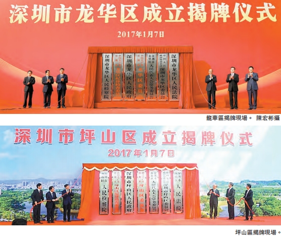 【香港商報網訊】記者王娜、焦家志報道:根據中央、省、市加快特區一體化、推動深圳新一輪改革發展的重大戰略部署,1月7日上午,龍華區、坪山區揭牌成立,宣告正式成為行政區。同時增設兩個行政區,成為深圳發展史上的一個重要事件,具有里程碑的意義。