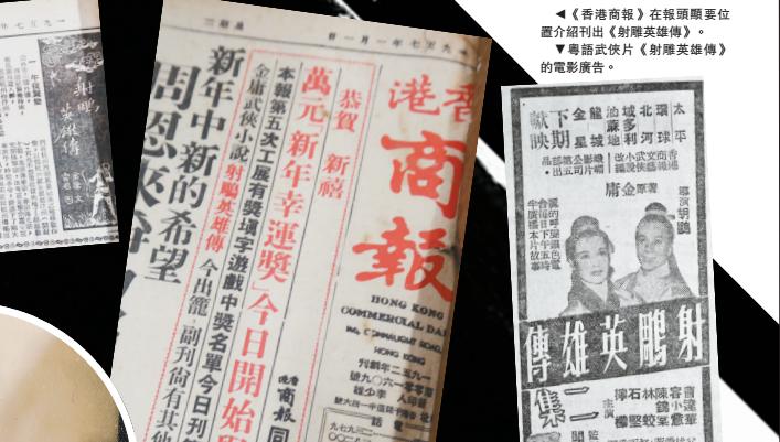 《射鵰英雄傳》是《香港商報》第一部副刊小說(也是金庸第一部作品)被搬上電影銀幕,由香港峨嵋電影公司於1958年拍成上下集的粵語武俠片,曹達華飾郭靖,容小意飾黃蓉,林蛟飾楊康、黎坤蓮飾穆念慈。金庸到1972年封筆不寫武俠小說,當然也不可能再為《香港商報》寫武俠小說,但他和《香港商報》還是有未了緣。他的《神鵰俠侶》於1996年以漫畫版出書,相隔四十年后授權在《香港商報》作全球性首刊,由1月29日至2月7日刊出,每天以兩大版彩色制作以饗讀者。金庸為此欣然寫下:「《神鵰俠侶》之前傳《射鵰英雄傳》於香港商報首刊至今將四十年矣」。