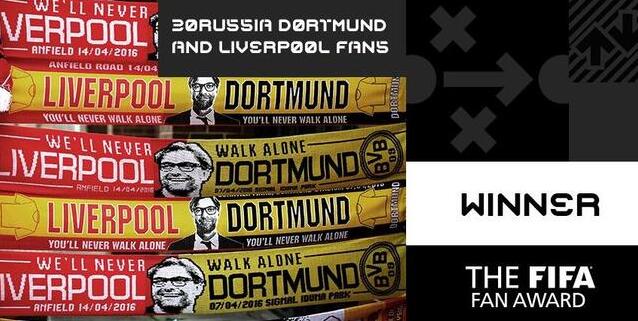 海牙球迷、多特與利物浦球迷和冰島球迷是最終3個候選,最終多特和利物浦球迷以45.92%的得票率當選FIFA最佳球迷獎。在上賽季利物浦與多特的歐聯杯1/4決賽上,兩隊球迷在現場同唱《你永不獨行》,場面令人動容。冰島球迷和海牙球迷的得票率分別是31.37%和22.71%。