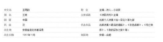 公開資料顯示,王明韻,1961年11月生,安徽省淮北市濉溪縣人,筆名蘭坡,2013年12月當選安徽省作協副主席。