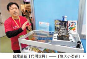 臺灣玩具公會今年繼續與臺灣經濟部國際貿易局合作籌組「臺灣形象專區」。區內增設「代間玩具」,展出同時適合小孩和老人的益智互動玩具,例如「飛天小忍者」通過按壓彈弓小忍者彈入紙城堡區內取分,從中鍛煉老人和小童的手部運動,又如「腳踏鈴」方便長者和小童用手或腳,跟隨顏色而奏出音樂。有玩具商指出,「代間玩具」正在臺灣興起,一套名為「挪亞方舟」推出一年,賣出1.5萬套,游戲設計玩者要把25種的動物放在仿如天秤的方舟,左右輕放,若失去平衡便全部跌倒。他說,香港的「挪亞方舟」主題公園曾有代售此玩具。