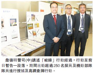 警方東九龍總區刑事警司(行動)詹德明昨日表示,打擊三合會是警務處處長首要行動項目,鑑於去年首兩季在東西九龍兩個警區發生連串涉及「新x安」黑幫組織的嚴重傷人、販毒、開賭及派系打鬥等罪行,包括去年4月一名24歲男子乘的士在觀塘繞道被兩輛私家車截停,男子被多人用刀斬至重傷,遂展開情報收集及調查,部署是次代號「峻鋒」的聯合反三合會行動,行動由本月3日展開,至前日暫告一段落,期間出動超過250名探員及機動部隊隊員進行搜捕及高調查牌行動。