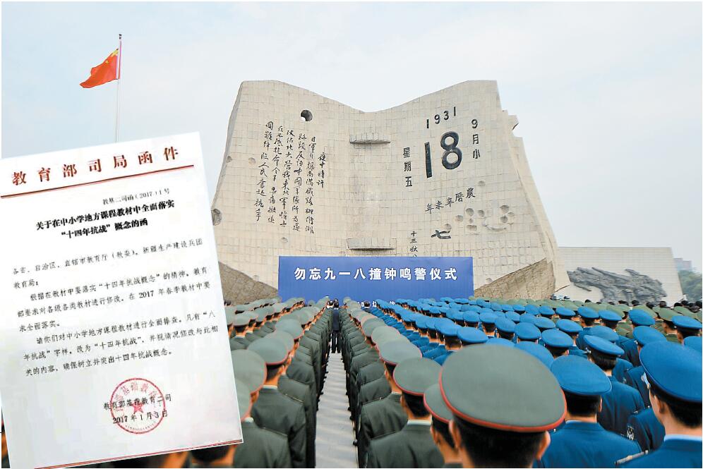 教育部基礎教育二司有關負責人昨日表示,落實「14年抗戰」概念是貫徹中央相關精神,去年10月,國務院相關負責人就曾批示教育部要全面落實「14年抗戰」概念,當時要求教育部各部門通力配合,兩個月前已要求全國基礎教育課程教材落實該概念,目前已全面完成修改。