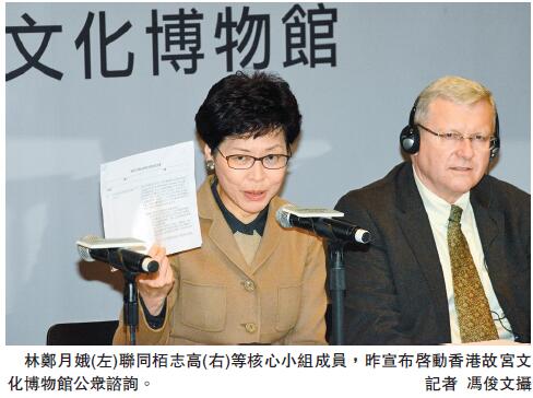 林鄭月娥昨午聯同籌辦香港故宮文化博物館的核心小組成員,包括管理局行政總裁志高、民政事務局常任秘書長馮程淑儀、康樂及文化事務署副署長(文化)吳志華,及前建築署副署長鄧文彬,一同出席記者會;香港故宮文化博物館設計顧問嚴迅奇亦有出席。