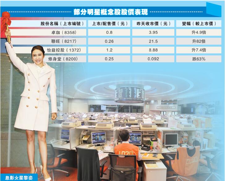 創業板新股股價向來波動大,一向是淘金「寶地」,近年被指明星效應最明顯的莫過於「翠如BB股」聯旺,雖其身份僅為公司大股東的女兒,但聯旺去年4月上市首日彈升15倍,從0.26元招股價殺上4元。另外張玉珊的修身堂(8200)2003年0.25元上市,首日升逾2倍,之后由毫子股升級至「蚊價股」,但隨著公司一供再供后,跌至成「仙股」。
