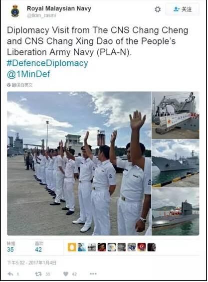馬來西亞皇家海軍在推特上是這么說的,這是中國海軍潛艇“長城”和遠洋打撈救生船“長興島”號,隨后發表聲明,這次中國海軍的造訪是中馬海軍友好交流的一部分。
