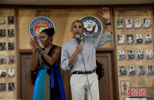 當地時間2016年12月25日,美國夏威夷,奧巴馬攜第一夫人米歇爾圣誕節拜訪夏威夷海軍陸戰隊基地。
