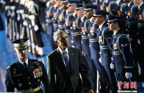 2017年1月4日,在美國首都華盛頓附近的邁爾·亨德森軍事基地,奧巴馬出席軍方為他舉行的歡送儀式。