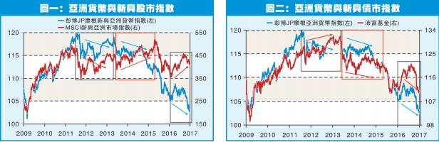 踏入2017年,美國炒加息,美元仍強,新興市場尤其亞洲國家仍面臨走資問題,而這對其資產市場將造成較負面的影響。以新興亞洲地區為例,圖一比較了金融海嘯后新興亞洲貨幣指數與股市走向。大方向上,兩者算是同向,即大家同在2011年見頂,其后都持續走低,只不過幅度上有所不同。但仔細看,2011年至今亞洲股市只是行了6年的上落市,因為去年低位未有跌穿2011年低位,但新興亞洲貨幣指數就已穿位而下,其餘時間如2014至2015年(紅色框)及去年(黑色框),股匯兩市都出現背馳情况。所以,如果以匯市看股市就有機會測錯市。