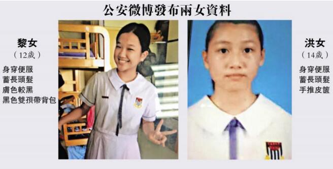 失聯兩名初中女生分別姓黎(12歲)和姓洪(14歲),屯門裘錦秋中學校長昨晚深夜以短訊回覆《大公報》記者,證實兩女為該校學生,他希望兩地警方盡快尋回兩名同學,及希望兩人平安回家。消息稱,洪姓女生曾經與其他同學參加校內歌唱比賽,高歌一曲《慈母頌》,有人在社交網站內留言稱她們為勇敢的中一少女。