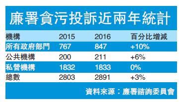 截至2016年12月底,除與選舉有關的投訴外,廉署共接獲2891宗貪污舉報,較2015年增加3個百分點。當中涉及私營機構的投訴1833宗;涉及政府部門的投訴847宗;而與公共機構有關的投訴則有211宗。委員會相信舉報數字增加,主要是反映廉署過去一年加強反貪宣傳工作的成效,現時并沒有跡象顯示貪污情況有所惡化。