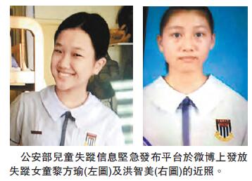 失蹤兩女童黎方瑜(12歲)及洪智美(14歲),同在裘錦秋中學(屯門)就讀中一,不同班但感情要好。副校長李胤鋒指,校方每日都有老師向家長跟進兩女情況,暫時未知兩女失蹤的原因,因兩女成績中等,操行中上,從無向校方求助,亦毋須社工跟進,難以理解失蹤因由。