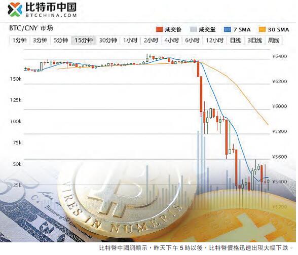 值得一提的是,在昨天監管單位發出進駐比特幣平臺的消息后,比特幣價格再度跳水,交易額快速放量。比特幣中國的報價從6370元開始暴跌至5300元左右,跌幅超15%;火幣網報價從6373元暴跌至最低5155元;幣行網報價亦從6384元暴跌至5308元,跌幅均超過1千元。