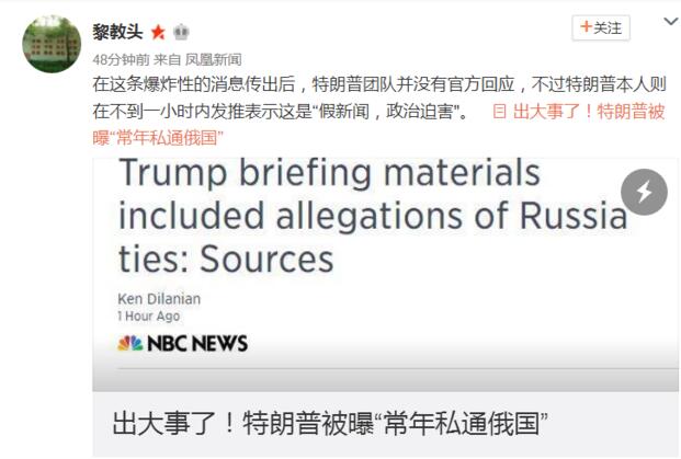 包括美國有線電視新聞網(CNN)、CNBC、美國國家公共電臺(NPR)和英國《衛報》在內的多家國際知名嚴肅媒體都報道稱,美國情報機構的四大核心(國情局局長、中情局局長、聯邦調查局局長和國安局局長)聯名上書特朗普和奧巴馬,表示美國的情報機關收到了一份由英國情報機構截獲、來源是俄羅斯情報人員的機密信息。這份機密信息顯示,俄羅斯長期以來培植、幫扶特朗普以助他贏得美國大選,俄羅斯介入特朗普事務至少已經有5年時間。此外,俄羅斯還通過釋放希拉里的有害信息、屏蔽特朗普的有害信息等情報操作攻擊特朗普的對手。