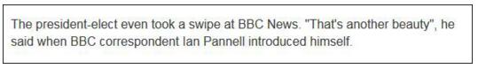 特朗普說,Buzzfeed網站是個垃圾新聞機構,它會因為發表所謂的俄羅斯文件而承擔后果。特朗普在記者會上也拒絕回答來自Buzzfeed和CNN記者的提問,說他們是“假新聞”。雖然CNN記者并沒有放棄,仍然在提問,特朗普堅決不給機會還教訓他“不要太粗魯”。隨后當BBC記者提問時,特朗普也譏諷說,“這是另外一個奇葩。”