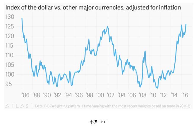 北京時間1月12日凌晨消息,據外媒報道,近年來,伴隨美國經濟狀況改善,以及美國逐漸啟動加息進程,美元匯率持續走高,Quartz網站刊文指出,目前美元的強勢程度,已經達到了1986年以來所僅見的程度,而這對于特朗普提振增長,創造就業機會的計劃無疑是一大利空,而他試圖通過指責別國操控匯率來讓美元貶值的想法,則完全與事實脫鉤,注定難以起到預期作用:
