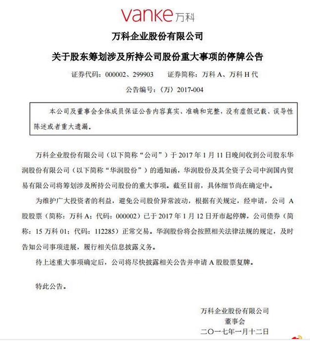 為維護廣大投資者的利益,避免公司股價異常波動,根據有關規定,經申請,公司A股股票(簡稱:萬科A;代碼:000002)已于2017年1月12日開市起停牌,公司債券(簡稱:15萬科01;代碼:112285)正常交易。華潤股份將會按照相關法律法規的規定,及時告知公司事項進展,履行相關信息披露義務。