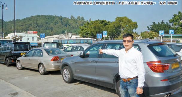 行至大澳巴士總站及停車場所見有大量私家車違泊,龍盛街周邊亦是違泊車輛,警方告示牌形同虛設。何紹基表示,高峰時段的下午4時開始,由昂坪、天壇大佛而來的一輛輛旅遊巴士滿載遊客抵達大澳,旅遊巴士未在指定的停車場泊車,駛入貨車停車場違例泊車,旅遊巴士乘客落車直接闖入行車路,造成人與車爭路的情況時有發生。而市民、遊人等候東涌市中心巴士的長龍打蛇餅,見頭不見尾,有市民稱,至少需要等候兩、三班巴士才能上車,等候時間會超過兩小時。何紹基表示,皆因道路設計和交通配套所致,重申根本解決辦法就是建沿海公路。有村民要求,全面開放大嶼山行車道,仿照西貢地區,全面取消「大嶼山封閉道路通行許可證」,但有團體指出,開放嶼南道,增加交通流量,並不符合以自然保育、可持續發展的康樂及綠色旅遊的規劃原意。、