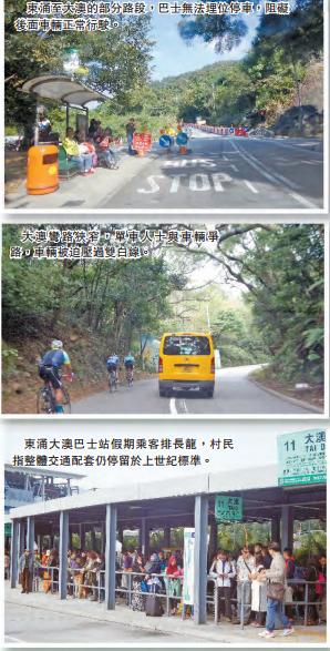當晚與會的嶼南居民指出,署方就嶼南梅窩及長沙地區有436個車位是足夠的,質疑署方只在昂坪觀察所統計的數據得出結論,未能反映實地情況,而政府聲稱近年沿嶼南道及山道進行多項擴闊路面及改善行車道彎位工程,大澳鄉委會副主席何紹基表示,有關工程只是小修小補的交差工程,沒有根本解決中短期交通配套不足問題。12月18日,周日上午十時許,記者隨何紹基實地觀察東涌新市鎮、梅窩及大澳兩個方向道路的交通配套設施。在東涌市巴士站前往大澳、梅窩及石壁站,長龍大隊,有時需要等兩班車才能上車。大嶼山的士站候車人多,十幾分鐘未見一輛車,有時卻是多輛車同時到站。其班次間隔大,都同嶼南道路狹窄、道路工程有關。沿東涌道至梅窩方向,行至貝澳村時所見道路兩旁都有十幾輛違泊車輛。轉行嶼南方向至大澳,沿途交通配套不足可見一斑,行至長沙、塘福及沙咀等數條村落,道路兩旁同樣有十幾輛違泊車輛,行至羌山道多斜道、急彎位,何紹基表示,連環式的急彎位道,更適合做賽車道。既然一些路旁有空間,可以擴闊,多個馬路邊的巴士站,可以改善,巴士靠站時埋位多些,增加其他車輛正常行駛,提升路面的使用率,同時,於道路兩旁或者道路單邊修築人行路、也可做單車人士避車處。