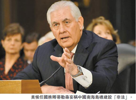 【香港商報网訊】在美國權力交替時期,有些美國官員又開始在中國問題上大作文章了。美總統當選人特朗普提名的國務卿人選蒂勒森,在昨日美國國會的任命聽證會上把指責焦點放在中國身上。蒂勒森表示,中國在處理朝鮮問題上僅是空洞承諾,貿易上也不按承諾行事,他甚至揚言,中國在南海行為是「非法」的,但他提到不該讓雙方歧見影響合作。值得注意的是,他談到將阻止中國奪取釣魚島。對美方的言論,中國外交部昨日回應,希望美方停止在主權問題上「選邊站隊」的言論。