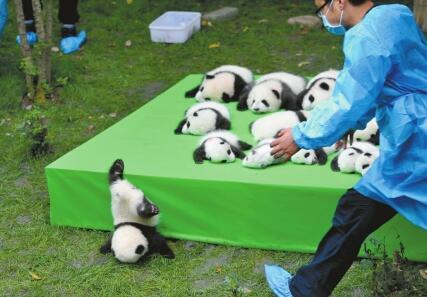 綠色地毯鋪成的舞臺上,23只熊貓寶寶集體亮相,活潑的“滾滾”們四處爬,其中一只不慎摔下舞臺,飼養員趕忙上前抱起……生動的一幕被攝影師定格。
