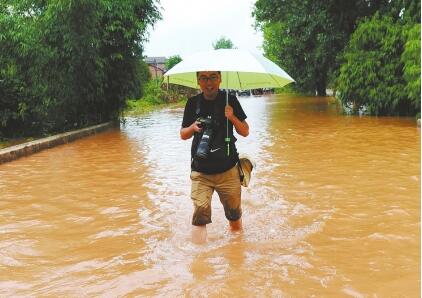 張磊在洪水中采訪。資料圖片