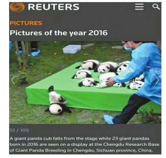 這條消息稱,去年9月,成都大熊貓繁育研究基地內,2016年度出生的23只大熊貓寶寶,全部被工作人員抱出來集體亮相,萌態十足吸引了眾多游客。一只熊貓寶寶不慎從“舞臺”上摔落,這一幕被攝影師捕捉下來。該照片入選路透社2016年度圖片,被美國《時代周刊》評為“2016年度動物類照片50佳”。