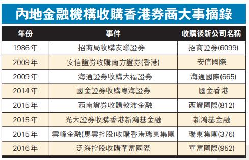 事實上,自滬港通、深港通開通以來,本港券商已成為內地資金追逐的對象。其中,最新大型收購包括全牌照券商華富國際(952)被泛海集團旗下泛海國際金融以約10.97億元收購。華富國際可謂絕無僅有的全牌照券商,持有香港證券交易、期貨合約交易、證券諮詢、企業融資等牌照。