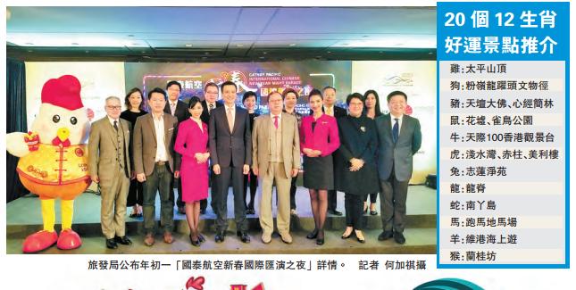 此外,旅發局今年亦邀請了玄學家劉國偉挑選了20個本港著名景點,推薦給游客及市民,其中花車巡游的路線更有助提升桃花及人緣運。而屬鸡的人士則推薦到太平山頂,除了可紓緩心情外,更有助提升工作地位。他們指,不少旅客也對傳統文化有興趣,故希望藉着今次推廣,讓他們發掘香港更多不同的地方。