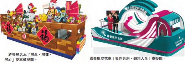 而今年花車的數量比去年少,旅發局節目及旅游產品拓展經理洪忠興昨指出,因香港藝術館正進行翻新工程,故可放置花車的位置較少,數目也便減少。他又指,整項活動斥資3300萬元,當中活動占2000萬元、推廣及宣傳則占1300萬元,預計活動可吸引15萬人到場觀賞,當中一半為本地市民、一半為游客。今年旅發局的花車名稱為「開年、開運、開心」,由鸡年吉祥物帶領出場,并用上多達22萬塊樂高積木建成,亦有20個各行各業的樂高人偶向大家拜年。國泰航空公司的花車則名為「與你共創、翱翔人生」,是首次以國泰及港龍航空的前線同事一同演出。