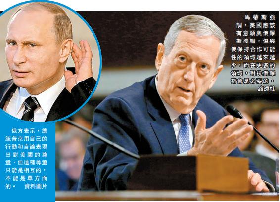 馬蒂斯當日在參院軍事委員會聽證會上指出,美軍目前還沒有強大到可以應對上述的挑戰。他強調,美國應該有意願與俄羅斯接觸,但是與俄保持合作可能性的領域越來越少,而在更多的領域,對抗俄羅斯會是必要的。馬蒂斯認為,目前最重要的就是要認清美國面臨的形勢,如何應對普京,而且要明白「普京在試圖破壞北大西洋軍事聯盟」。在使用核武、遵守國際公約等方面俄也對美國構成潜在危險。