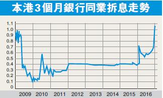 美國2015年底首次加息四分一厘之後,去年12月底又再度加息四分一厘,但由於香港資金充裕,尚未需要跟隨加息,但美國聯儲局暗示,今年可能會再加息3次,比早前市場預計的加息步伐明顯加快。事實上,從香港銀行拆息走勢可見,現時香港3個月銀行同業拆息,已升至金融海嘯以來的新高,倘若美息續升,港美息差進一步擴闊,留在本港的熱錢勢將回流美元,搏取更高的息率回報。當相當一部分熱錢撤出,香港便正式要踏入加息周期,供樓負擔增加,勢必影響內地買家買樓意欲,世界最貴的香港樓價不回調也勢必降溫,但估計要下半年才會出現。