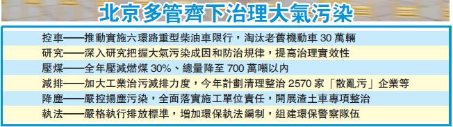 北京代市長蔡奇在昨日開幕的市人大會議發表政府工作報告時亦指,雖然北京市去年的二氧化碳排放按年下降約5%,PM2.5年均濃度下降9.9%,但人口資源環境矛盾仍然突出、空氣污染、交通擠塞及垃圾污水治理任務艱巨,需要很大功夫治理「大城市病」。