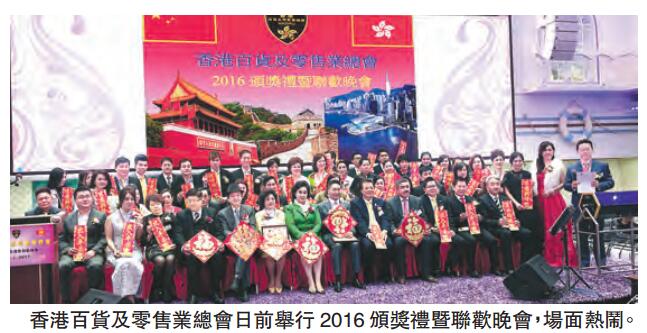 【香港商報訊】記者霄虹報道:香港百貨及零售業總會日前假紅磡黃埔花園煌府酒家舉行2016頒獎禮暨聯歡晚會,主禮嘉賓包括第九屆全國政協常委鄭蘇薇,立法會議員邵家輝,香港巴基斯坦總商會主席白祖威,香港東帝汶總商會執行主席詹瑪莉,九龍總商會理事長李鳳翔,香港百貨及零售業總會榮譽主席李光華、榮譽顧問蕭炎坤。當晚各界嘉賓友好與該會同仁近300人聚首一堂,共賀新年,場面熱鬧。