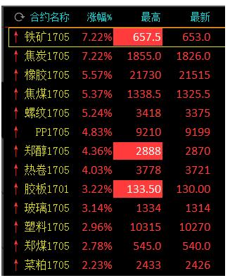 截至收盤,焦炭、鐵礦主力收盤漲逾7%,橡膠、螺紋、焦煤漲超5%,PP、鄭醇、熱卷漲超4%,玻璃漲超3%,塑料、鄭煤、菜粕、大豆漲超2%,豆粕、淀粉、PVC、錳硅、硅鐵、滬鎳、滬鋅漲超1%。鄭棉、雞蛋、滬鋁、白糖收跌。