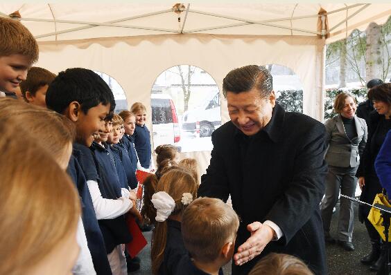 图为习近平在伯尔尼克尔萨茨火车站观看瑞士童声合唱团表演后,与合唱团的小演员交流。 新华社
