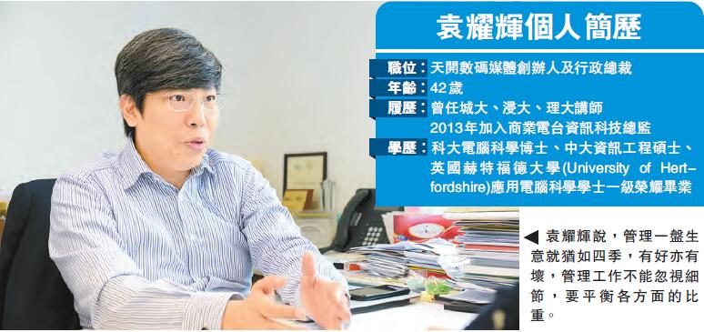 較早前港視網劇《導火新聞線》引爆全城,令網劇成為大眾焦點。網劇的成功,離不開流暢的網站播放技術,該劇提供技術的天開數碼媒體(TFI)更將技術拓展至與地產代理合作辦「視頻看樓」程式。本報記者訪談TFI創辦人兼行政總裁袁耀輝,聽聽他18歲時白手興家賺取第一桶金的訣竅,還有創業這些年,遇過的挑戰與解決方法。