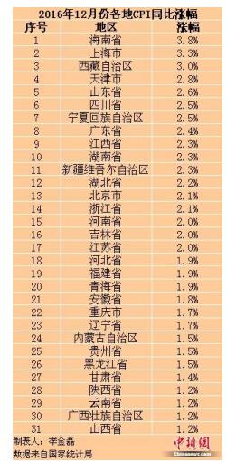 中新網北京1月17日電(記者 李金磊)國家統計局近日公布了全國31個省(區、市) 2016年12月份居民消費價格指數(CPI)。數據顯示,多地去年12月份CPI漲幅較11月份有所擴大。其中,漲幅最高(3.8%)的海南已啟動對全省低收入群體發放價格臨時補貼。