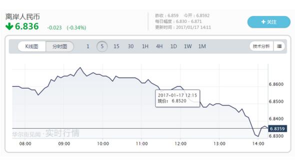 午后,離岸人民幣短線上漲,盤中一度漲破6.83。北京時間14:00左右,離岸人民幣兌美元報6.8302,為1月13日以來最高,日內漲近300點。