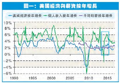筆者一向認為美國經濟增長正放緩,這是大家不得不留意的。參照月初美國公布的一系列勞工數據,可見市場對美國經濟前景仍然樂觀,因為月初公布的非農職位及失業率皆不理想,唯獨平均時薪增長超出預期,令市場十分鼓舞。不過,勞工市場情況真的那麼理想嗎?無錯,現時美國平均時薪按年增長2.9%,是2010年來的高位(見圖一)。近年耶倫常不肯加息,都是因為這數據作怪。