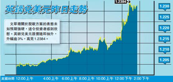 受消息影響,英鎊兌美元匯價隨即抽升,英鎊兌美元匯價隨即抽升逾3%,高見1.2384。富時100指數跌幅則擴大至0.6%。市場避險情緒降溫,日圓和黃金回吐升勢。美元兌日圓自日內觸及的一個半月低點反彈80點至113.50,跌勢收窄至0.6%;現貨黃金從日內稍早觸及的近兩個月新高1218.90美元高位回落8美元至1210.80美元附近。這也顯示英國「硬脫歐」的疑慮,已經在周一被市場提前消化。
