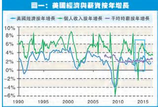 筆者一向認為美國經濟增長正放緩,這是大家不得不留意的。參照月初美國公布的一系列勞工數據,可見市場對美國經濟前景仍然樂觀,因為月初公布的非農職位及失業率皆不理想,唯獨平均時薪增長超出預期,令市場十分鼓舞。不過,勞工市場情况真的那麼理想嗎?無錯,現時美國平均時薪按年增長2.9%,是2010年來的高位(見圖一)。近年耶倫常不肯加息,都是因為這數據作怪。
