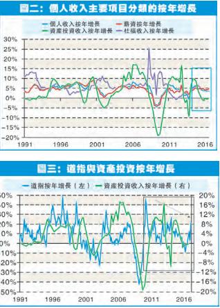另外,大家要留意BEA資產投資收入去年已跌至按年收縮。資產投資於整體個人收入占一成五,是第三大占比,BEA指出資產投資屬於企業分派的利息收入。如是者,圖三見到,這種收入與道指都出現同升同跌情况。而且,縱使道指直冲2萬點,但其按年增長趨勢卻一直下滑。BEA亦有數據指出美國企業盈利趨勢正持續回落,因此,美國人在未來的投資收入亦有機會收縮。企業盈利跌,道指回調,影響了個人收入,消費市道也不會太好,這在近年消費類的職位增長逐漸放緩都可見一斑。