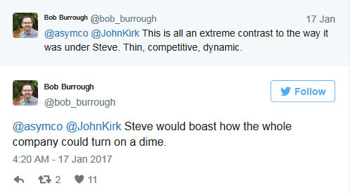 Burrough稱他支持將鮑爾默和庫克進行對比。他今天早些時候還發推稱蘋果不再是一個“動態的改變者”。