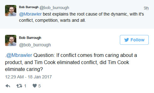 但不是所有的前蘋果員工都同意Burrough的看法。Tony Fadell這位蘋果前高管稱在蘋果“從來沒有競爭”。