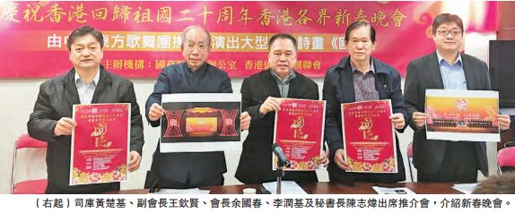 【香港商報訊】記者謝巧玲報道:香港僑界社團聯會昨日在會所舉行「2017年文化中國四海同春香港各界新春晚會」簡介會,會長余國春,副會長王欽賢、李潤基以及該會首長出席。今年的新春晚會由中國東方歌舞團擔綱演出大型舞蹈史詩《國色》,將於2月9日及10日一連兩天在紅磡香港體育館上演,兩場新春晚會4000張門票,將於1月20日(星期五)下午2:30在銅鑼灣社區中心禮堂公開免費派發,先到先得。