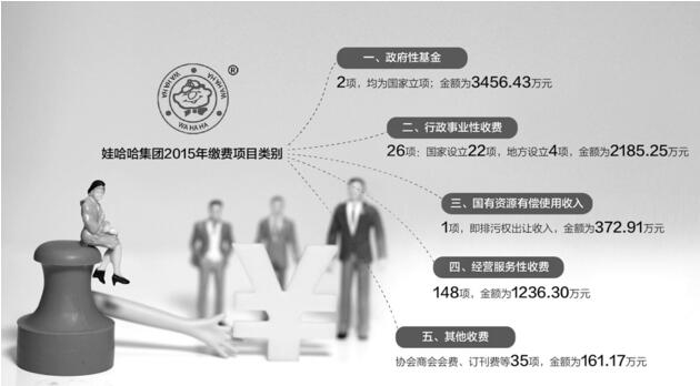 此前,娃哈哈集團提供了所屬131家企業2013年以來曾發生過的繳費項目共533項。據財政部官網的回應,2015年娃哈哈集團及所屬企業的繳費金額總共達7412.07萬元,主要涉及五大類項目。