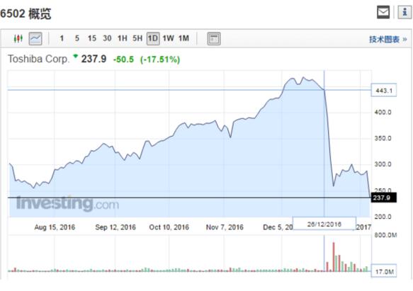 東芝股價自此開啟了暴跌之路。相比于2016年12月的高點,東芝股價已近乎腰斬。